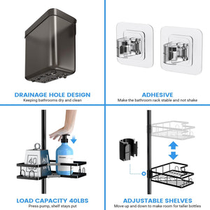 Organizează-ți baia inteligent și elegant cu această etajeră de colț cu prindere prin tensionare, fără găurire. Fabricată dintr-un aliaj metalic rezistent la umezeală și echipată cu rafturi încăpătoare, cârlige și suport pentru săpun, este soluția ideală pentru depozitarea tuturor produselor de igienă personală într-un mod ordonat și accesibil.