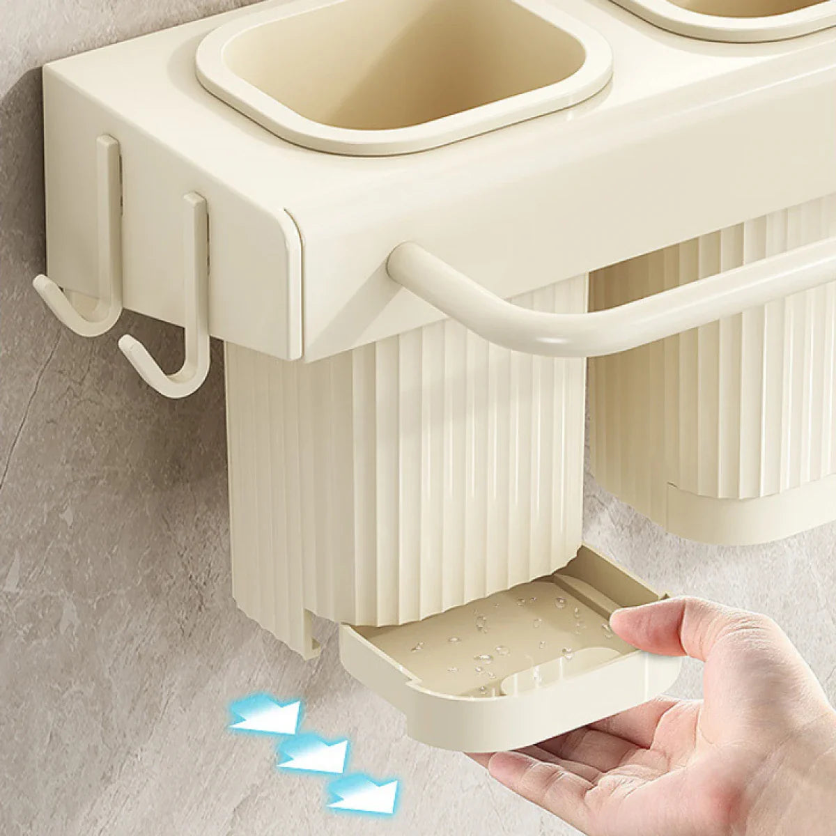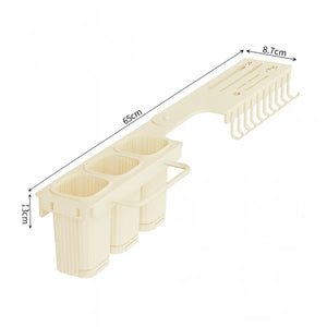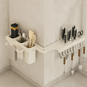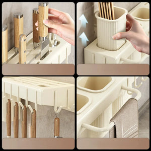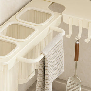 Design multifunctional – dispune de 3 compartimente pentru depozitarea ustensilelor, spatii dedicate pentru cutite, 10 carlige pentru accesorii (spatule, teluri, linguri etc.) si un suport pentru laveta sau prosop.