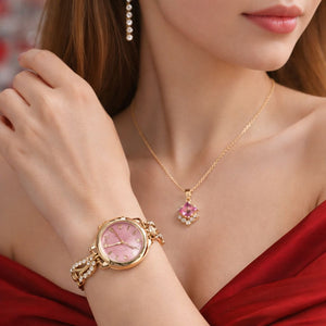 Set elegant dedicat femeilor care apreciaza detaliile rafinate si accentele feminine. Ceasul are carcasa aurie si cadran roz delicat, decorat cu elemente stralucitoare, oferind un aspect sofisticat si romantic. Bratara ceasului este ornamentata cu cristale fine, completand perfect designul elegant.