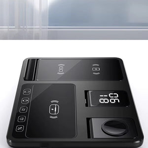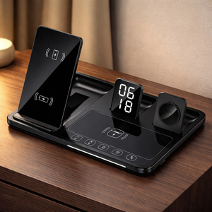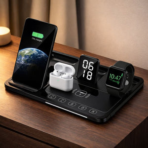 Aceasta statie de incarcare inteligenta este solutia ideala pentru organizarea biroului sau a noptierei, oferind incarcare rapida si simultana pentru mai multe dispozitive. Designul modern cu finisaj negru lucios se integreaza perfect in orice spatiu, oferind atat functionalitate, cat si un aspect elegant.