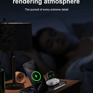Dispozitivul permite incarcarea wireless a telefonului, castilor si smartwatch-ului in acelasi timp, eliminand complet cablurile incurcate. Suportul inclinat permite utilizarea telefonului atat in pozitie verticala, cat si orizontala, fiind ideal pentru apeluri video, vizionare sau notificari.