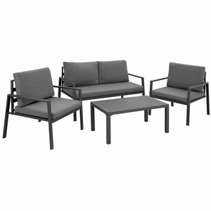 Adauga un plus de eleganta si confort spatiului tau exterior cu acest set de mobilier din aluminiu, format din 4 piese esentiale: o canapea cu doua locuri, doua fotolii si o masa de cafea cu design modern. Ideal pentru terasa, gradina, balcon sau zona de lounge.