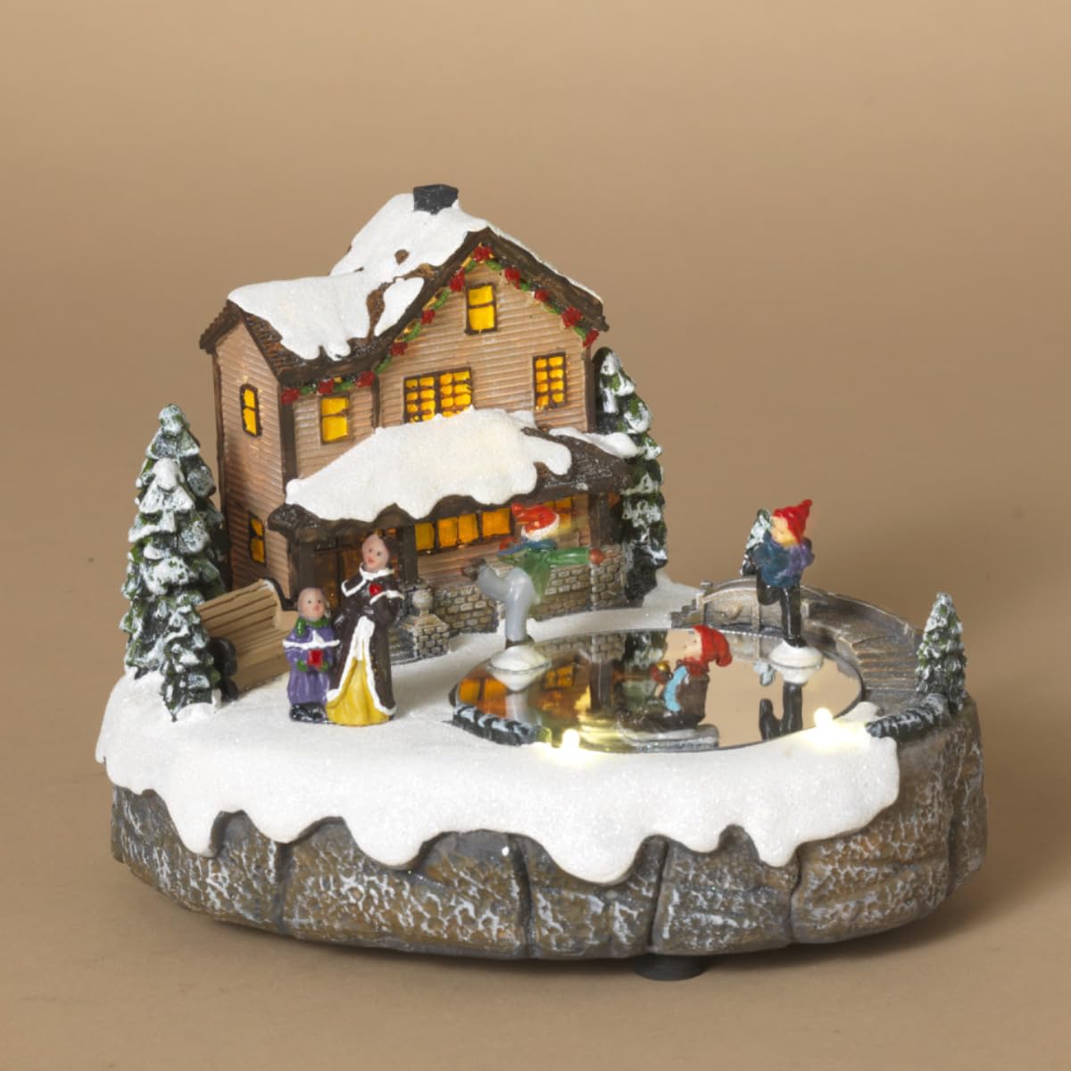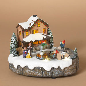 Suprafata din sticla iluminata se rotește lent, iar micii patinatori se misca in cerc, creand o scena plina de farmec. In fundal, casuta luminoasa completeaza imaginea de poveste.