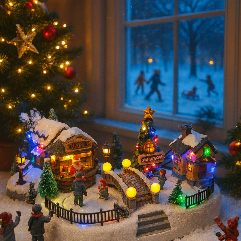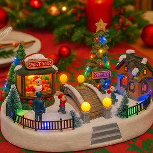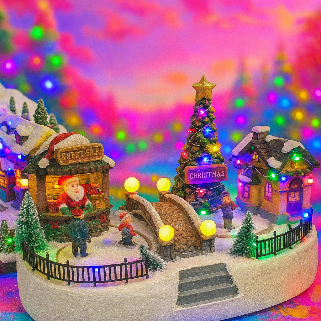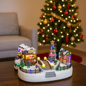 Adu spiritul Craciunului in casa ta cu aceasta decoratiune fermecatoare, realizata sub forma unui sat de iarna luminat. Scena include casute impodobite, un pod decorativ, brazi inzapeziti si un stand unde Mos Craciun ii intampina pe cei mici. Un decor premium, plin de culoare si lumina, perfect pentru sarbatori.