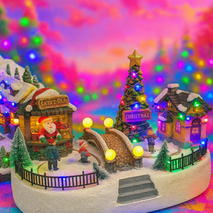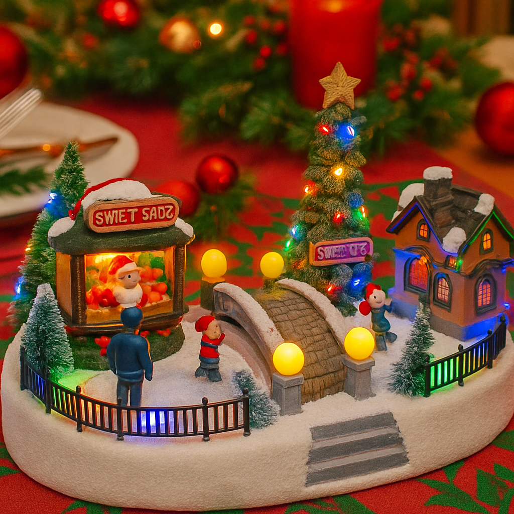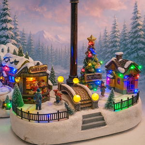 Realizat din rasina de calitate, decorul reda fidel atmosfera unui sat festiv: brazi cu zapada, pod din piatra, felinare luminate, figurine si casute de poveste.