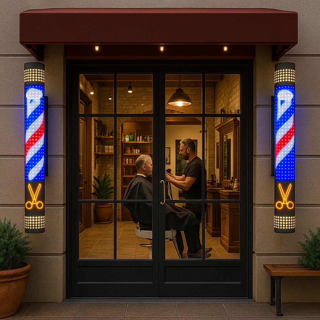 Dispozitivul include iluminare LED dinamica, cu efect de miscare, special conceputa pentru frizerii moderne. Lampa poate fi montata atat la interior, cat si la exterior, avand carcasa din plastic rezistent si consum redus de energie.