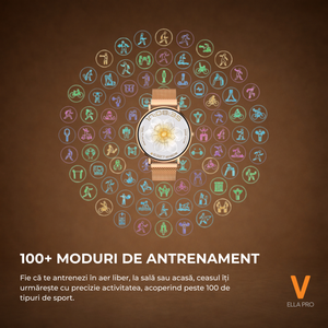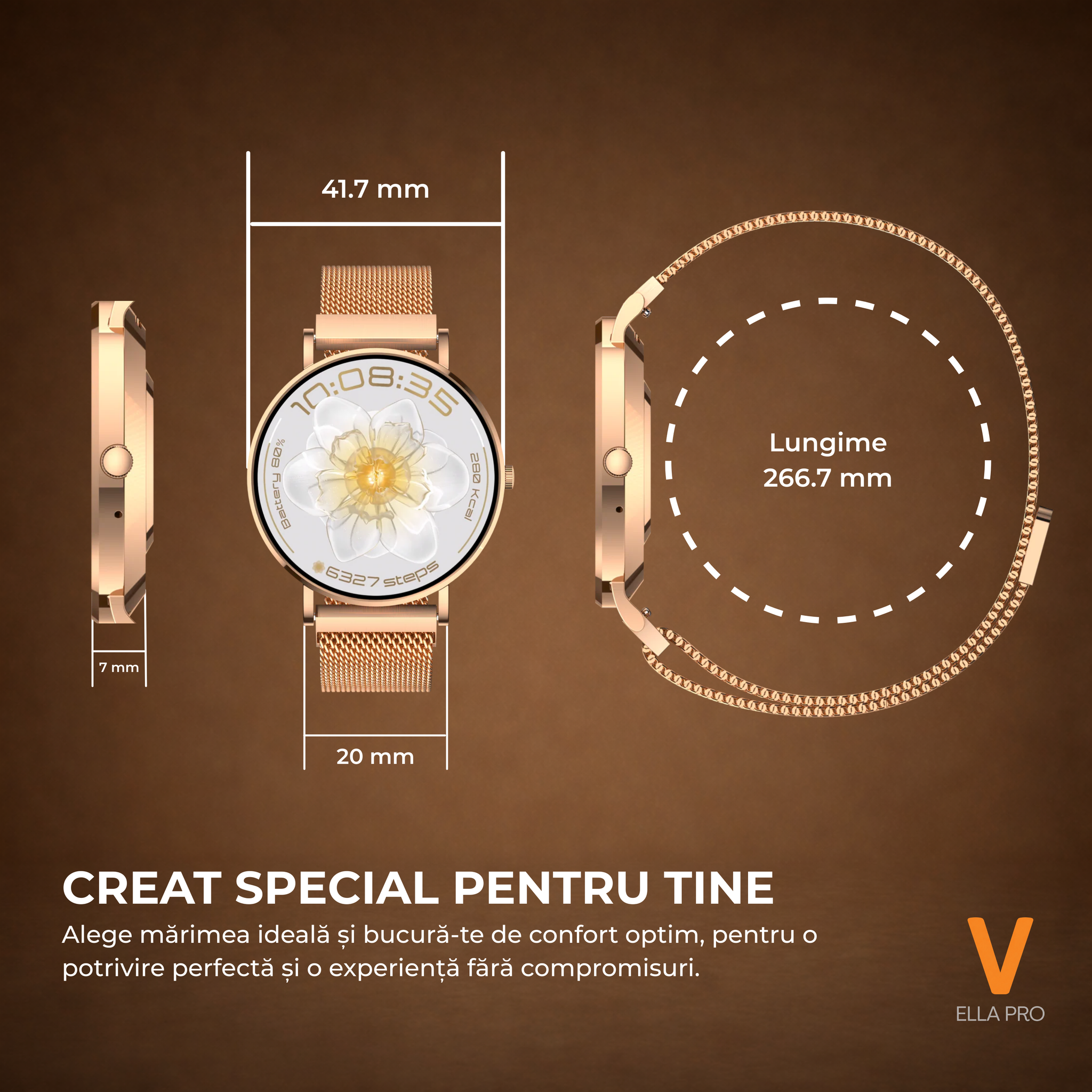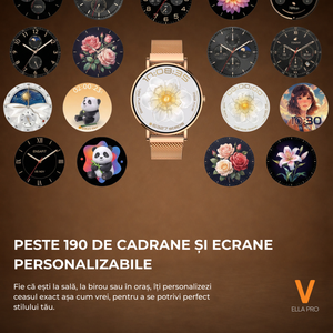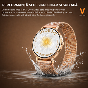 Noul ceas smartwatch pentru damăVivendo® ELLA PRO îmbină eleganța cu tehnologia modernă. Este compatibil cu toate telefoanele cu sistem de operare Android 6.0 sau iOS 9.0 și mai noi (Samsung, Huawei, iPhone, Xiaomi, Motorola, OnePlus, Oppo etc.).