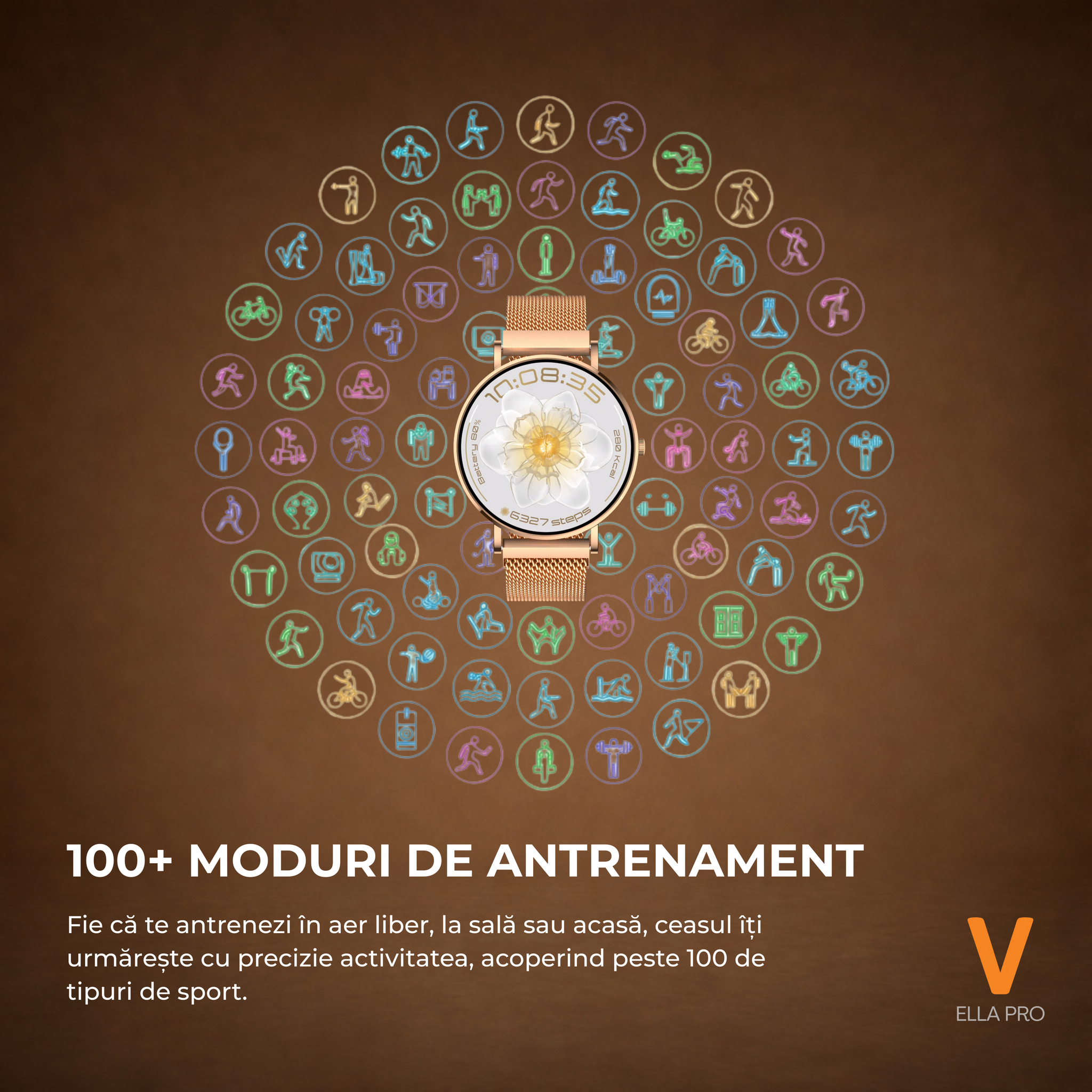 Ceas Smartwatch Dama ELLA PRO Vivendo®, Ecran AMOLED 1.32", Fitness, Apel Bluetooth, Notificari Limba Romana, ChatGPT AI, Incarcare Wireless, Rezistent Apa IP68, 2 Curele Incluse