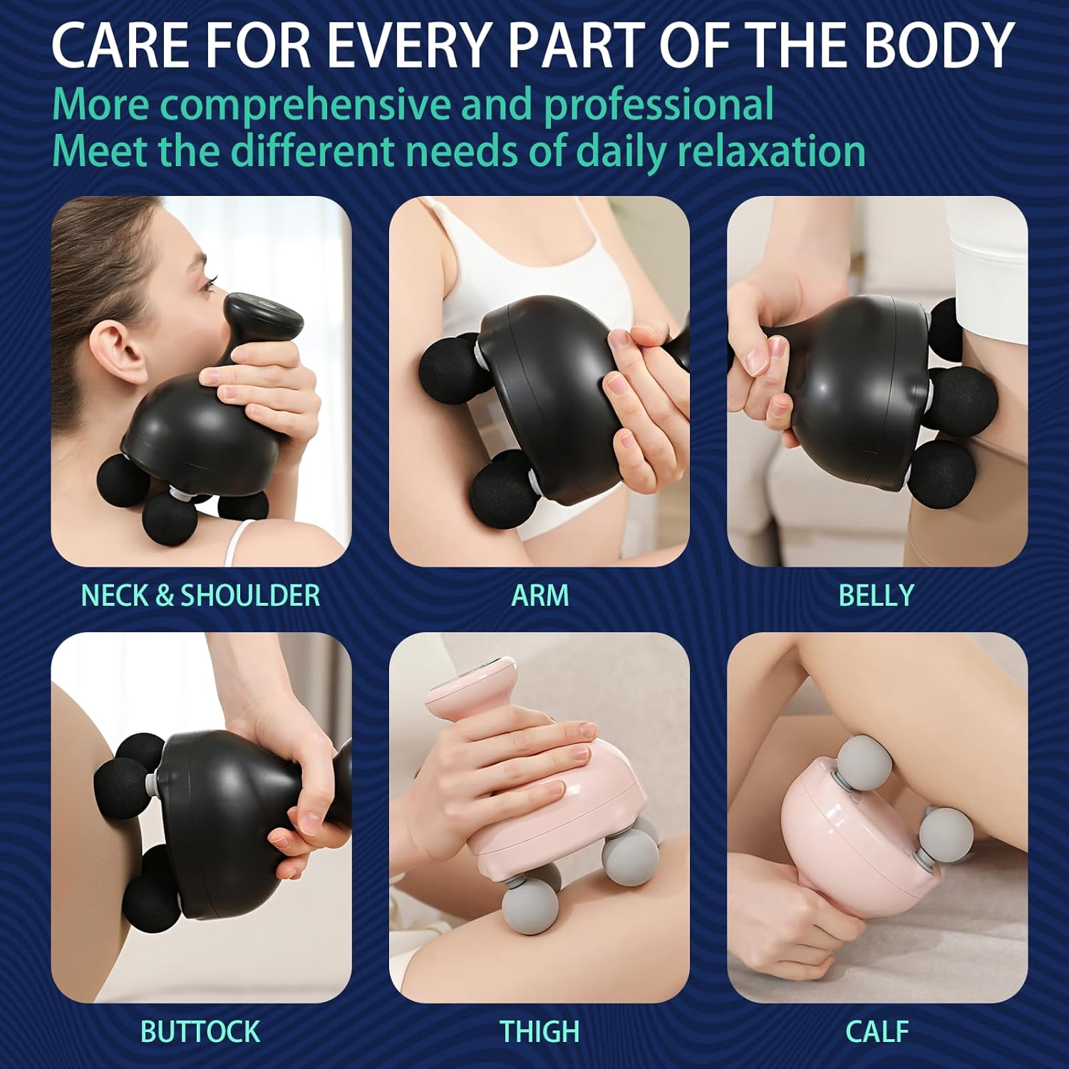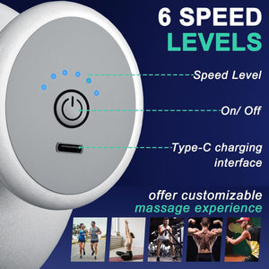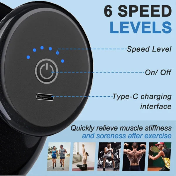 Dispune de 4 capete interschimbabile si 6 viteze reglabile (1200–2500 RPM), astfel incat poti adapta masajul la orice grup muscular. Funcioneaza excelent ca masaj pentru picioare, masaj pentru coapse, masaj pentru brate, abdomen sau zona lombara.