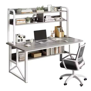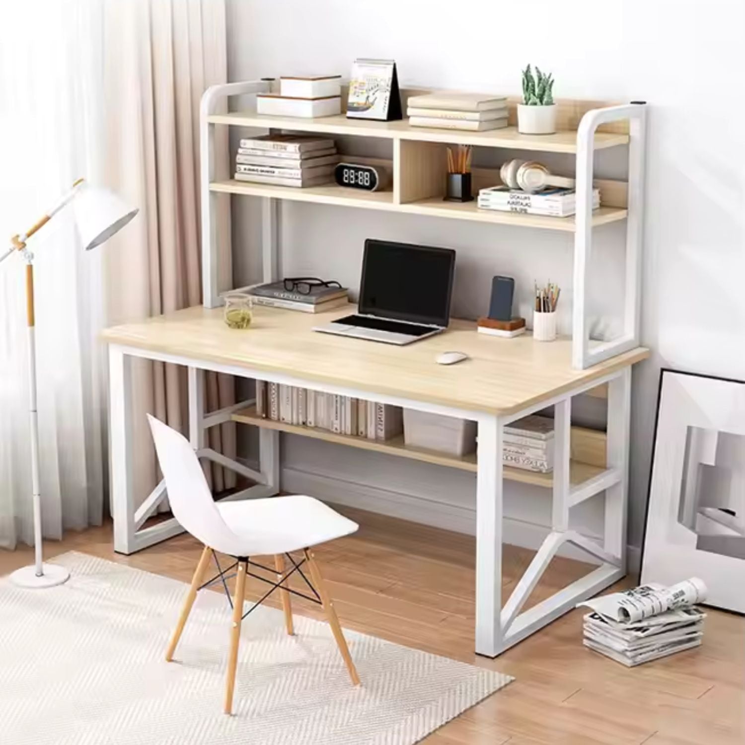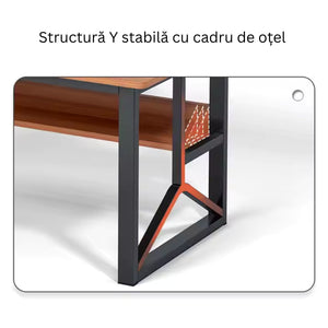 Blatul generos și rafturile deschise integrate oferă suficient spațiu pentru laptop, documente, cărți și obiecte personale. Structura este realizată din PAL melaminat rezistent și susținută de un cadru metalic durabil, ideal pentru utilizare zilnică.