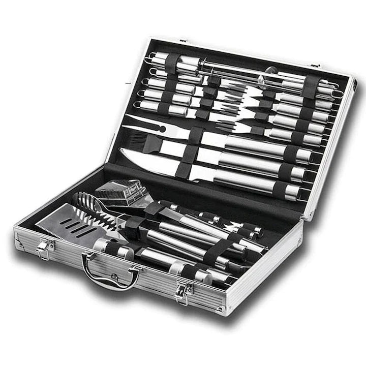 Set ustensile gratar, otel inoxidabil, 24 piese, servieta