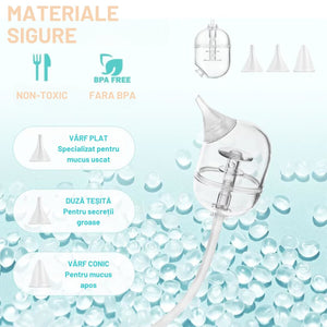 Dispozitivul este conceput pentru a curata delicat si eficient nasul bebelusilor, eliminand mucusul si congestia care pot ingreuna respiratia, somnul si hranirea.