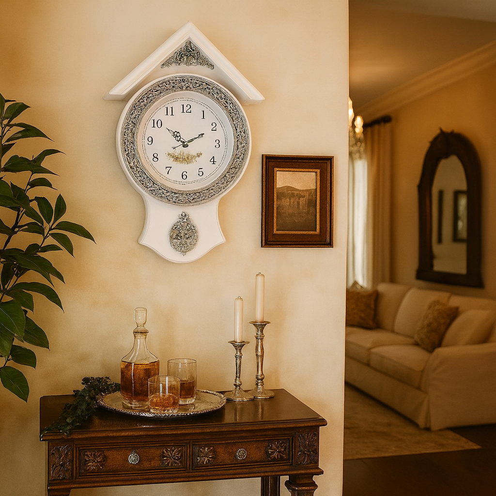 Adauga un plus de stil si rafinament locuintei tale cu acest ceas de perete realizat intr-un design tip casuta, cu detalii decorative atent lucrate. Este potrivit pentru orice incapere si poate deveni cu usurinta un cadou inspirat pentru cei dragi.