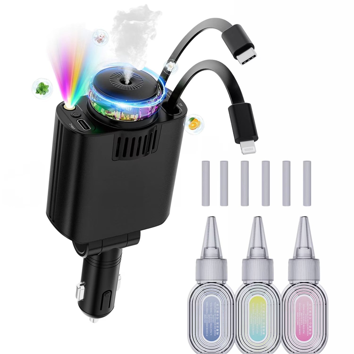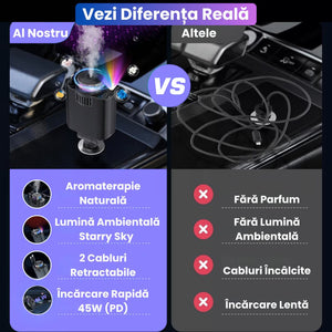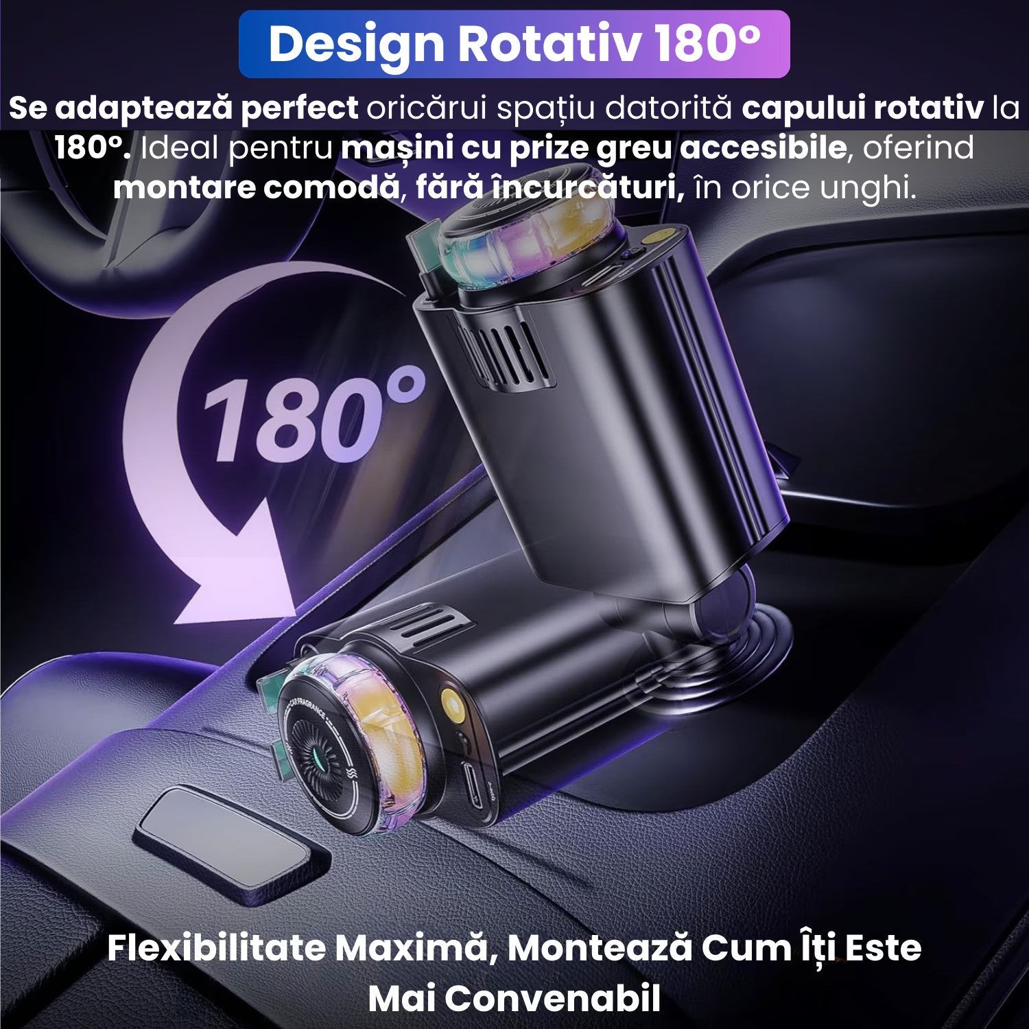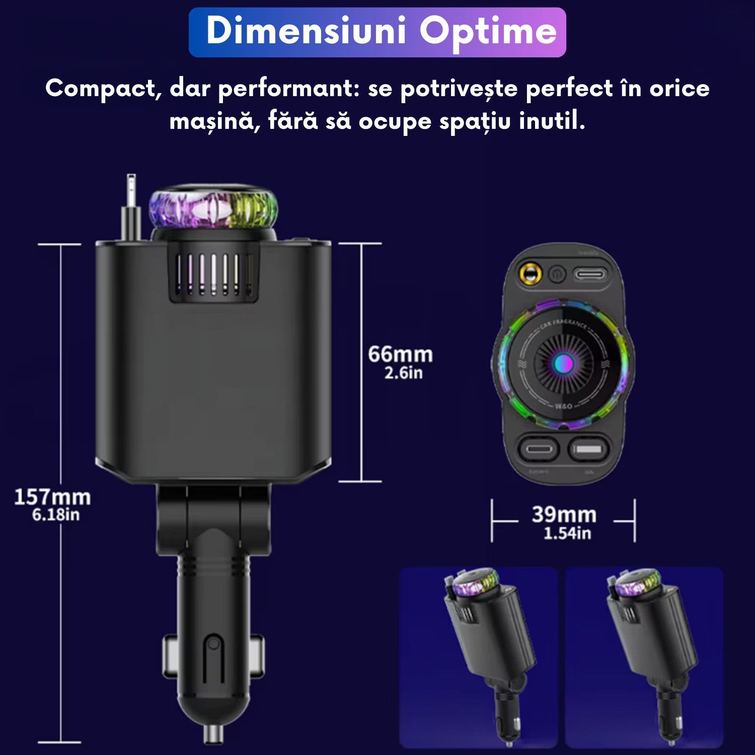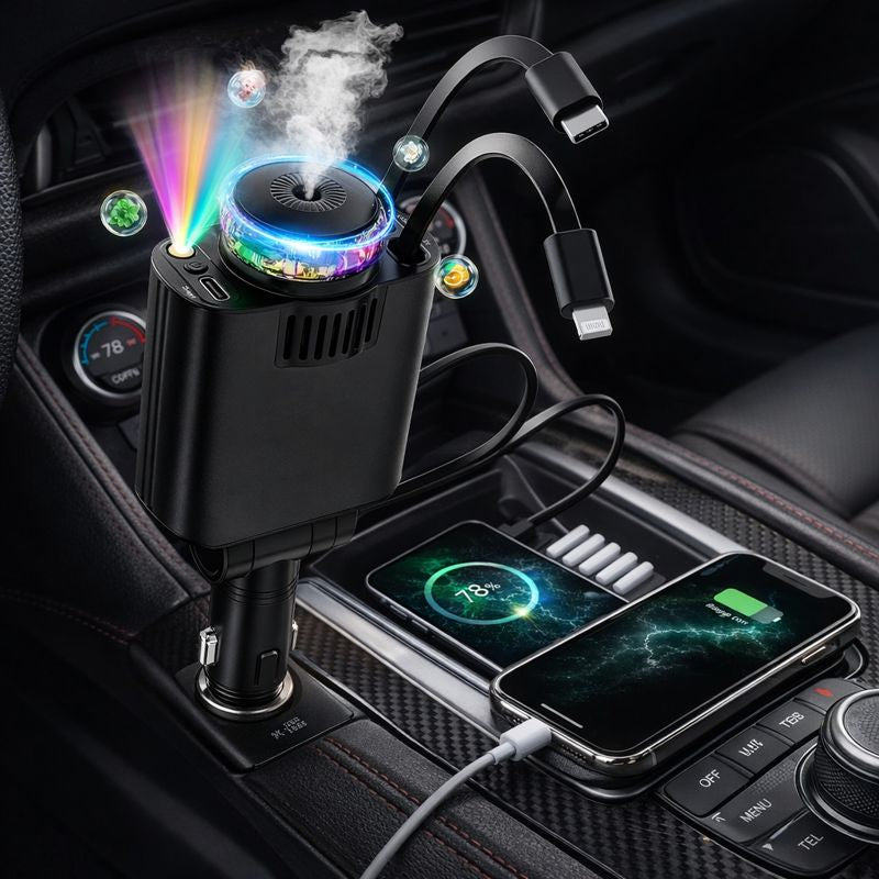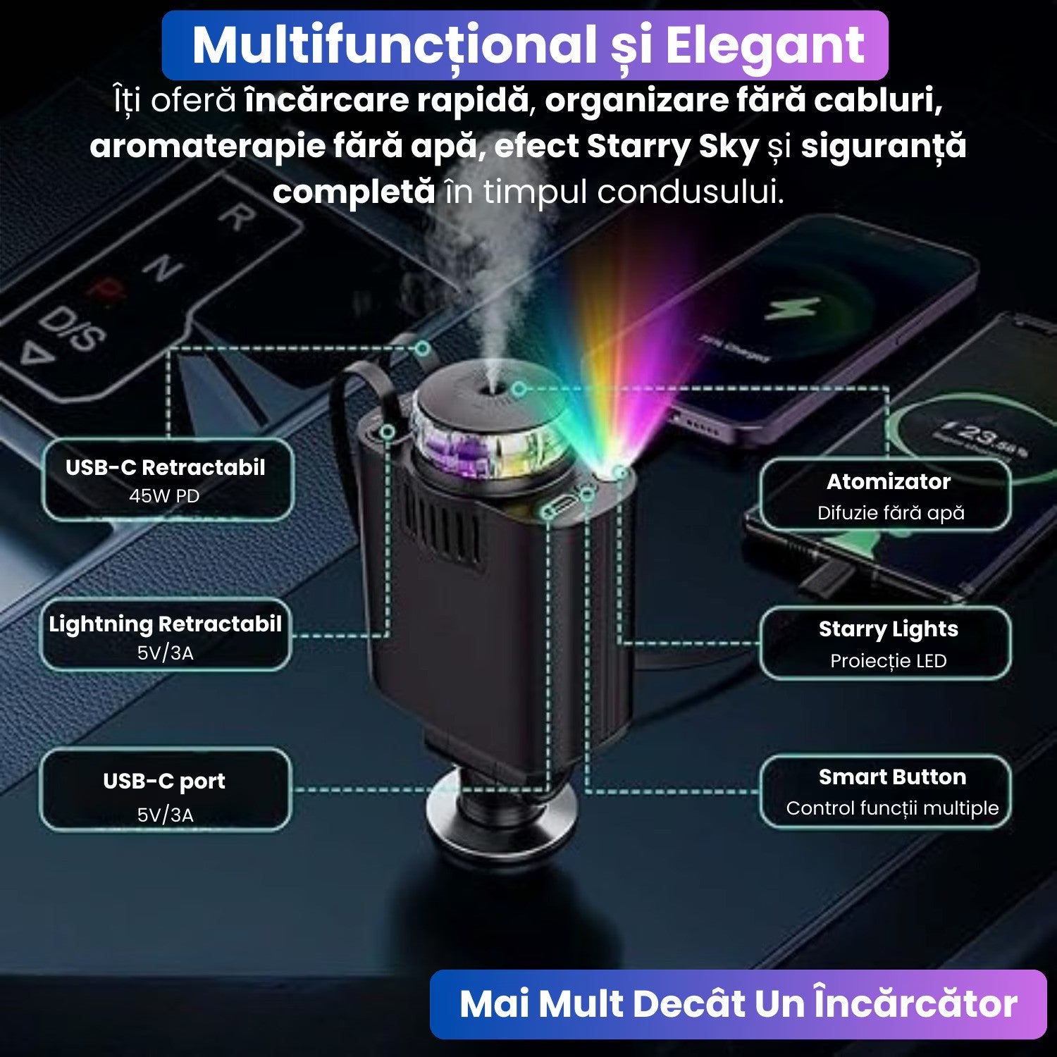 Incarcator Auto Retractabil 5-in-1 este solutia completa pentru masina ta: incarcare rapida, aromaterapie fara apa si lumina ambientala spectaculoasa – totul intr-un singur dispozitiv compact si elegant.