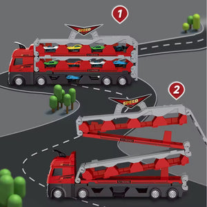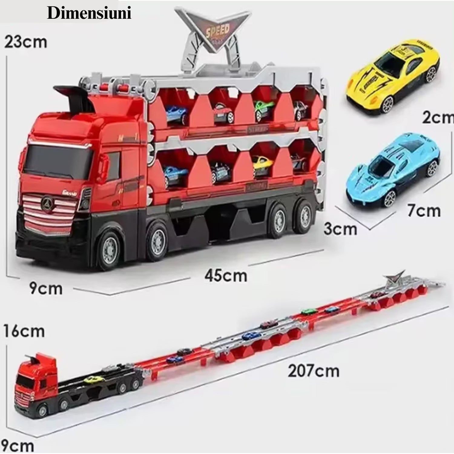Acest camion trailer pentru transport masini de curse este o jucarie interactiva care combina depozitarea masinutelor cu o pista de curse lunga de 2.07 metri pentru distractie maxima. Camionul se transforma rapid intr-un circuit de curse cu lansatoare duble, unde copiii pot concura cu prietenii sau familia.