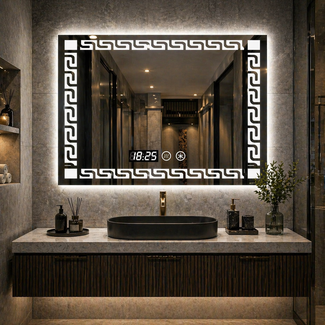 Aceasta oglinda cu LED are o expresie vizuala puternica, definita de echilibrul dintre eleganta contemporana si detaliul decorativ cu influenta grafica. Modelul repetitiv al ramei adauga profunzime compozitiei si transforma oglinda intr-un element care atrage privirea fara sa domine spatiul. Intr-un interior finisat in tonuri minerale, nuante inchise si texturi naturale, oglinda contribuie la o atmosfera coerenta, sobra si rafinata.