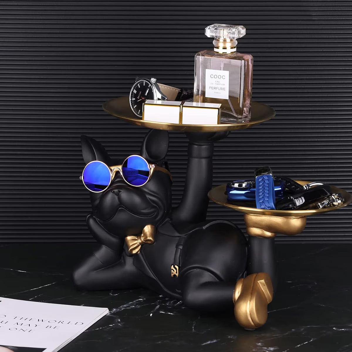 Cu un aspect modern si detalii atent lucrate, bulldogul cu ochelari de soare si papion devine rapid un element decorativ de impact in orice incapere.