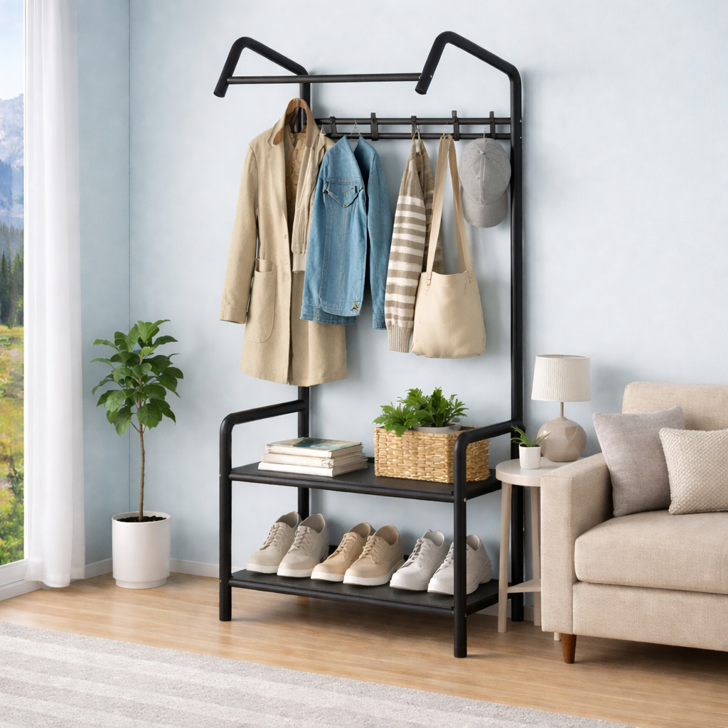 Datorita combinatiei dintre bara pentru haine si polita pentru incaltaminte, ofera o solutie practica de depozitare chiar si in spatii restranse.
