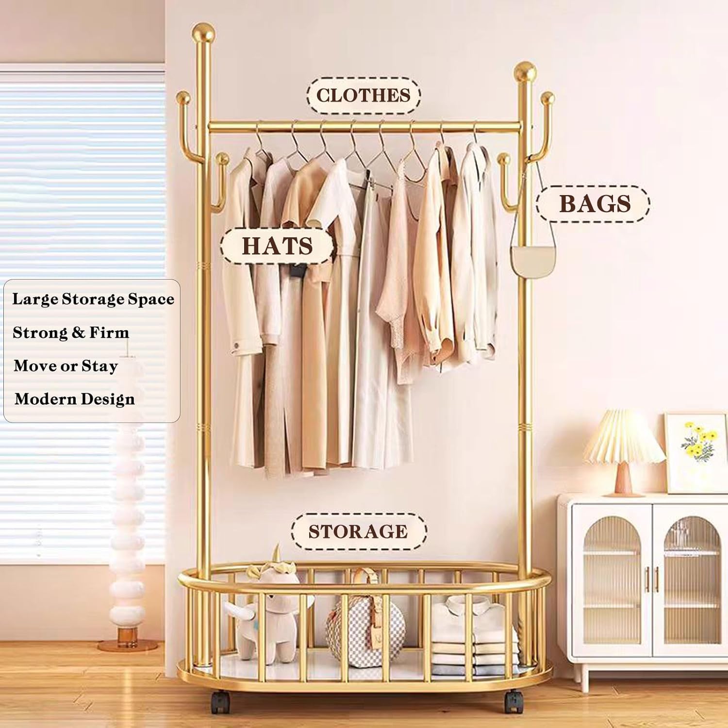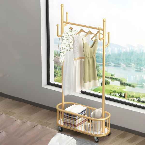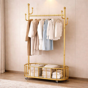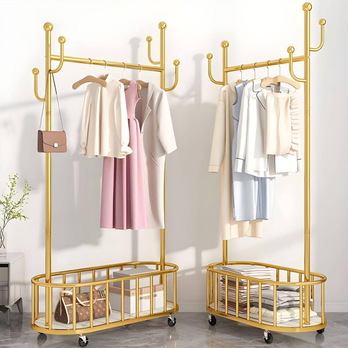 Acest suport de haine cu roti si cos de depozitare, realizat din structura metalica rezistenta cu finisaj auriu, imbina eleganta cu functionalitatea, fiind ideal pentru dormitor, dressing, hol sau spatii comerciale precum magazine si showroom-uri.