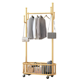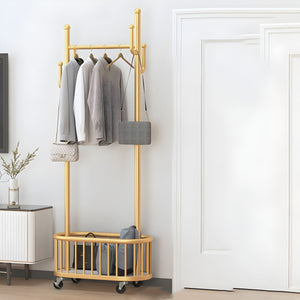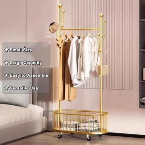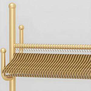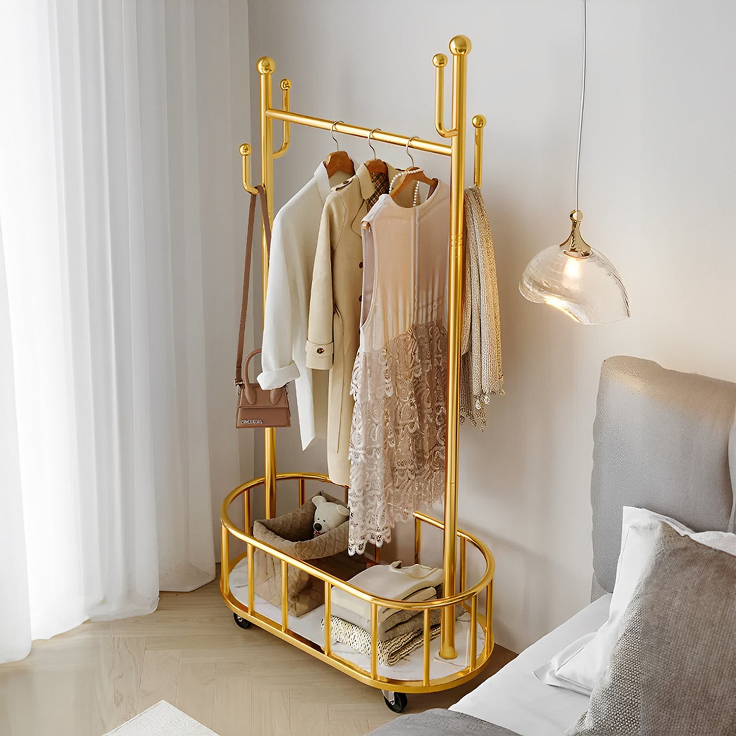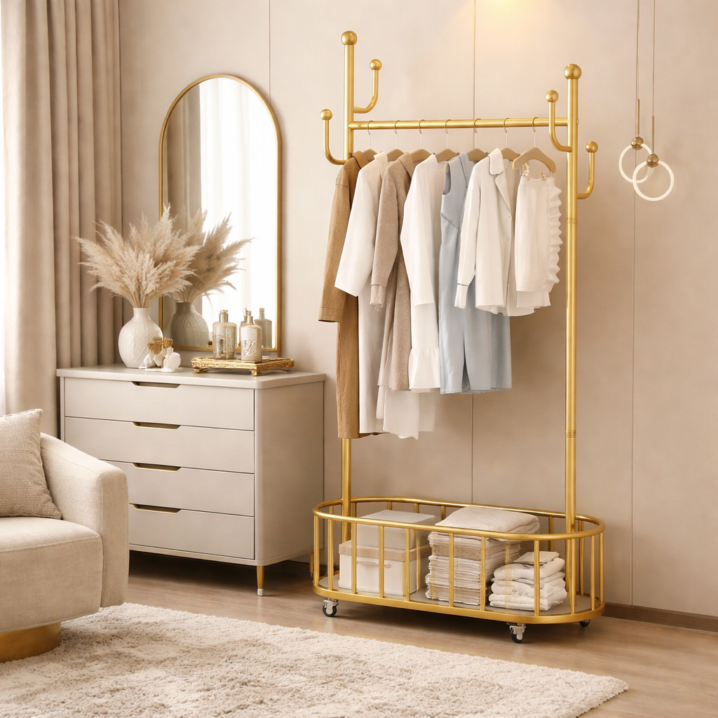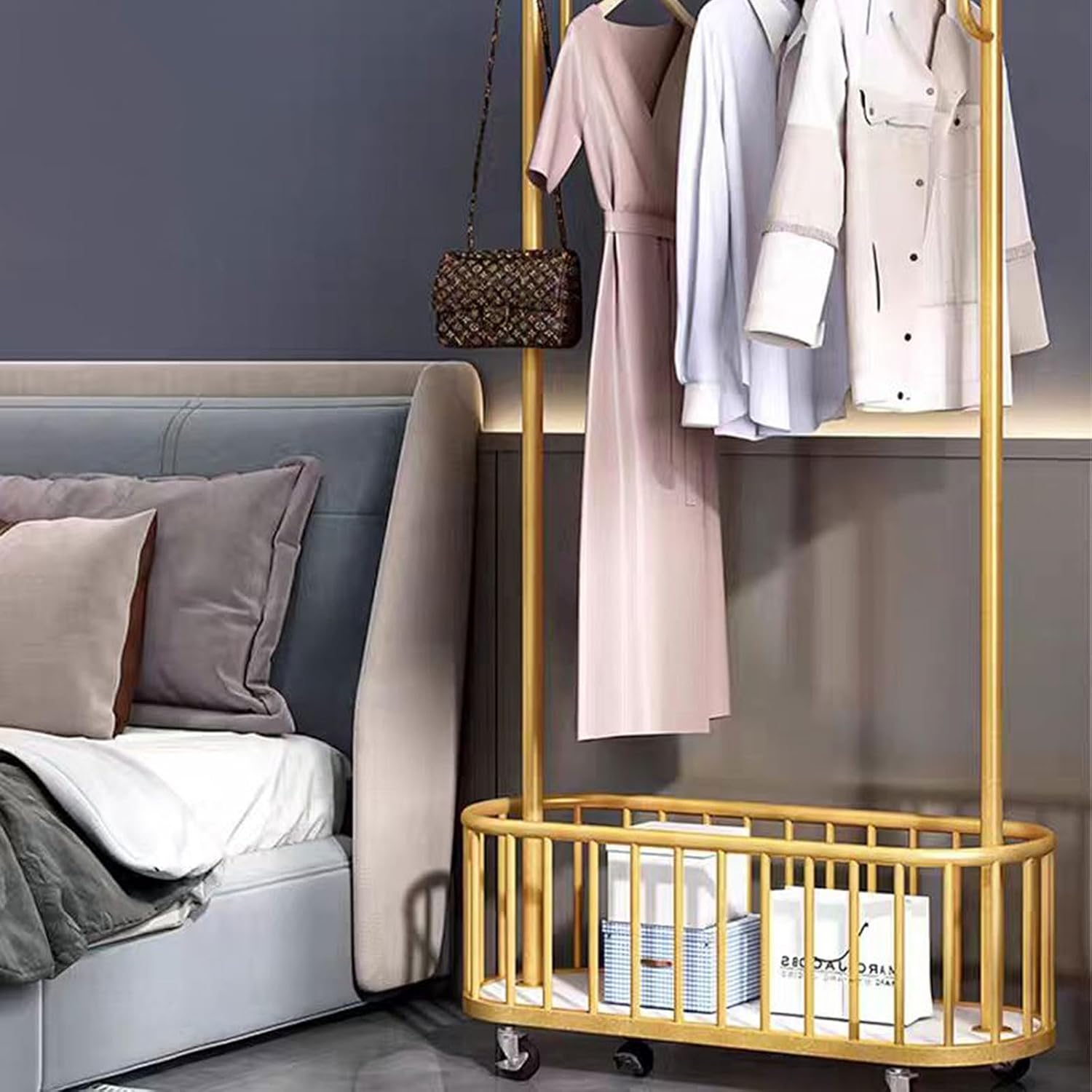 Acest suport de haine cu roti si cos de depozitare, realizat din structura metalica rezistenta cu finisaj auriu, imbina eleganta cu functionalitatea, fiind ideal pentru dormitor, dressing, hol sau spatii comerciale precum magazine si showroom-uri.