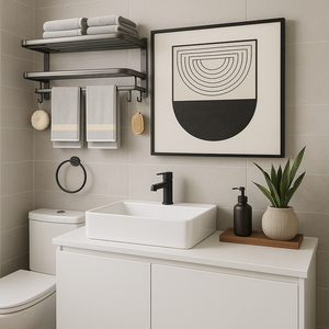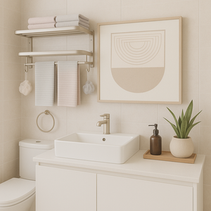 Spatiu amplu de depozitare: Designul pe 2 niveluri ofera mai mult loc pentru depozitare si organizare, mentinand baia aerisita si ordonata.