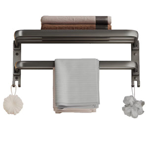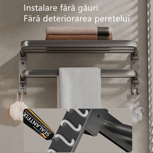 Suport dublu pliabil: Raftul superior sustine prosoape de baie, haine sau produse de ingrijire, iar bara inferioara si carligele sunt perfecte pentru prosoape de maini, bureti sau mingi de baie.