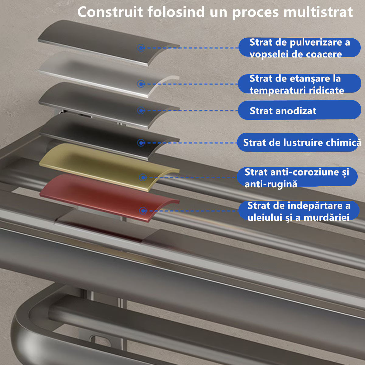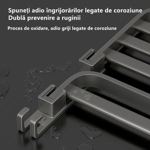 Material premium: Fabricat din aluminiu spatial si otel carbon, rezistent la rugina, coroziune si zgarieturi. Finisaj gri metalic elegant, usor de curatat si durabil in timp.